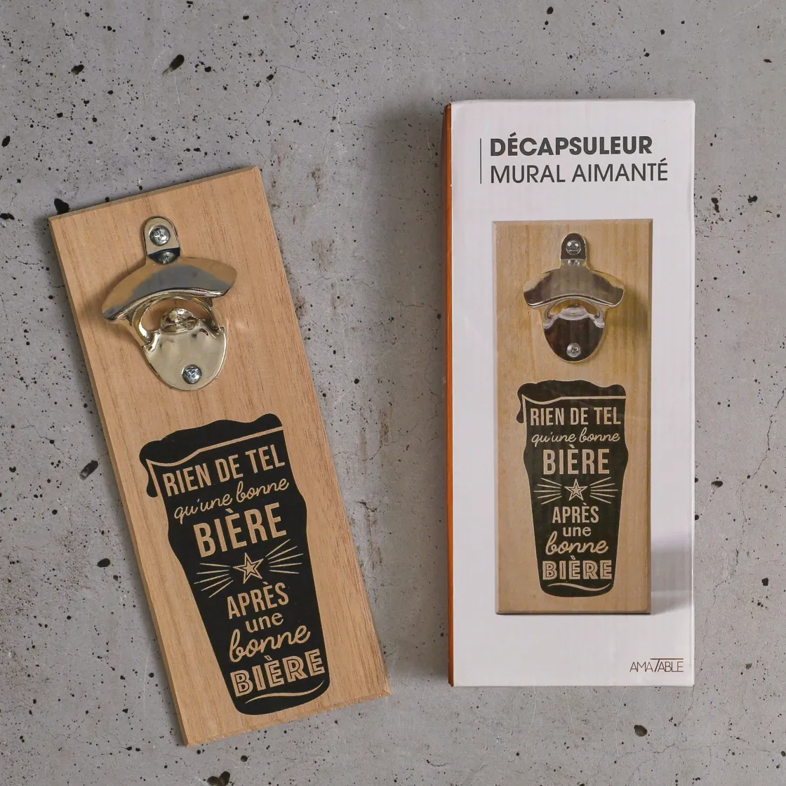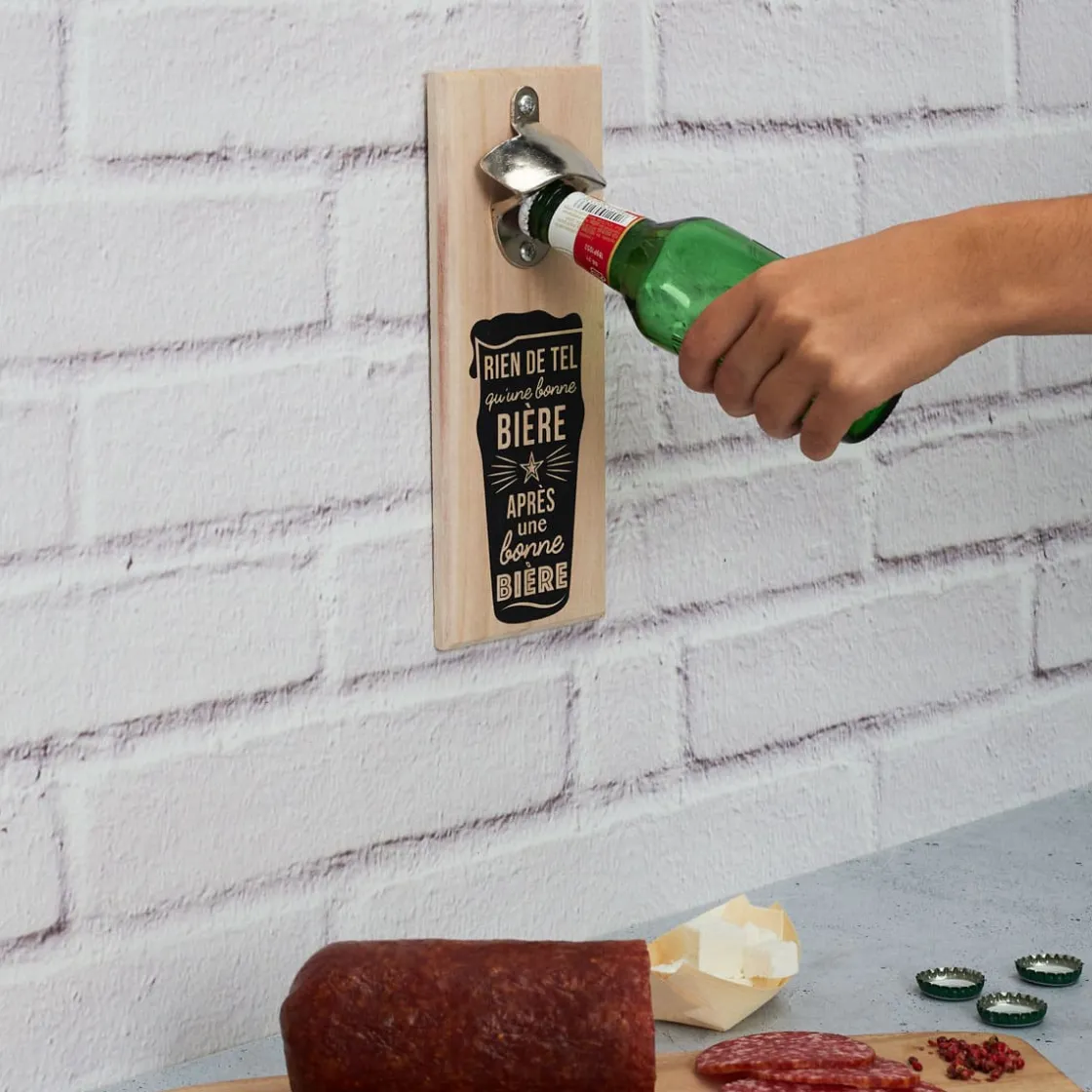 Chez vous, la bière, c’est sacré ! Seul ou avec des invités, vous en prenez une, puis deux… Pas de temps à perdre, il faut enchaîner ! Vous n’êtes même plus obligé de vous déplacer jusqu’à la poubelle, votre décapsuleur aimanté mural se charge de collectionner vos trophées. Une idée de cadeau Noël originale pour les amateurs de bière à l’humour bien trempé !