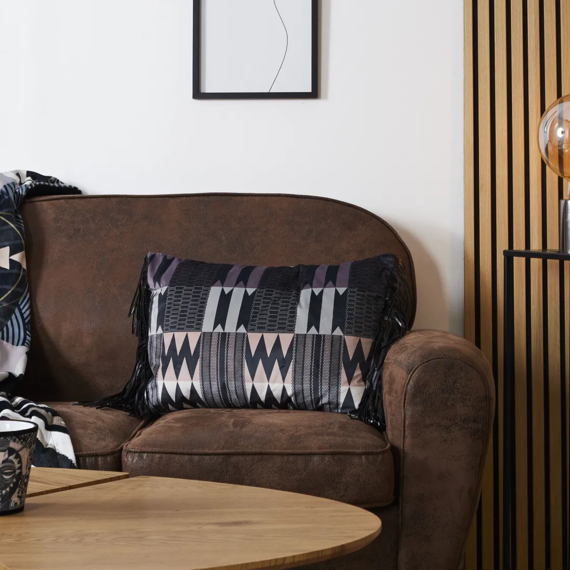 Ce coussin CAMANA, vous transportera avec ses motifs ethniques et orignaux en association avec son velours et de ses franges en simili-cuir qui lui donne son aspect intense. Avec cette vivacité, soyez certain de délivrer chaleur, confort et profondeur à votre décoration d’intérieur. Son élégance naturelle pourrait devenir la pièce maîtresse de votre habitat. Une idée de cadeau qui vous emporte et vous fait voyager.