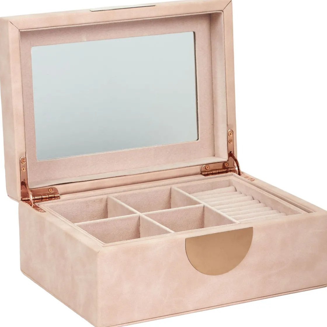 Cette boite à bijoux bohème aux tons nude décorera votre chambre en gardant vos accessoires bien rangés. Un grand miroir très pratique et différents compartiments pour les trier de manière logique et surtout sans les abîmer. Sur une coiffeuse, une étagère ou un bureau, son style chic et sa couleur poudrée apporteront une touche élégante à l’endroit où vous la poserez. À adopter ou à offrir sans plus tarder !