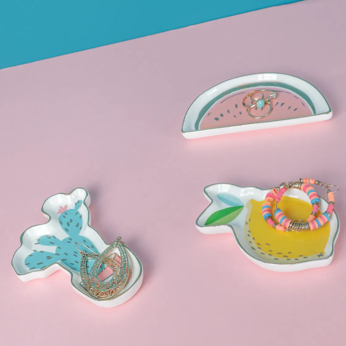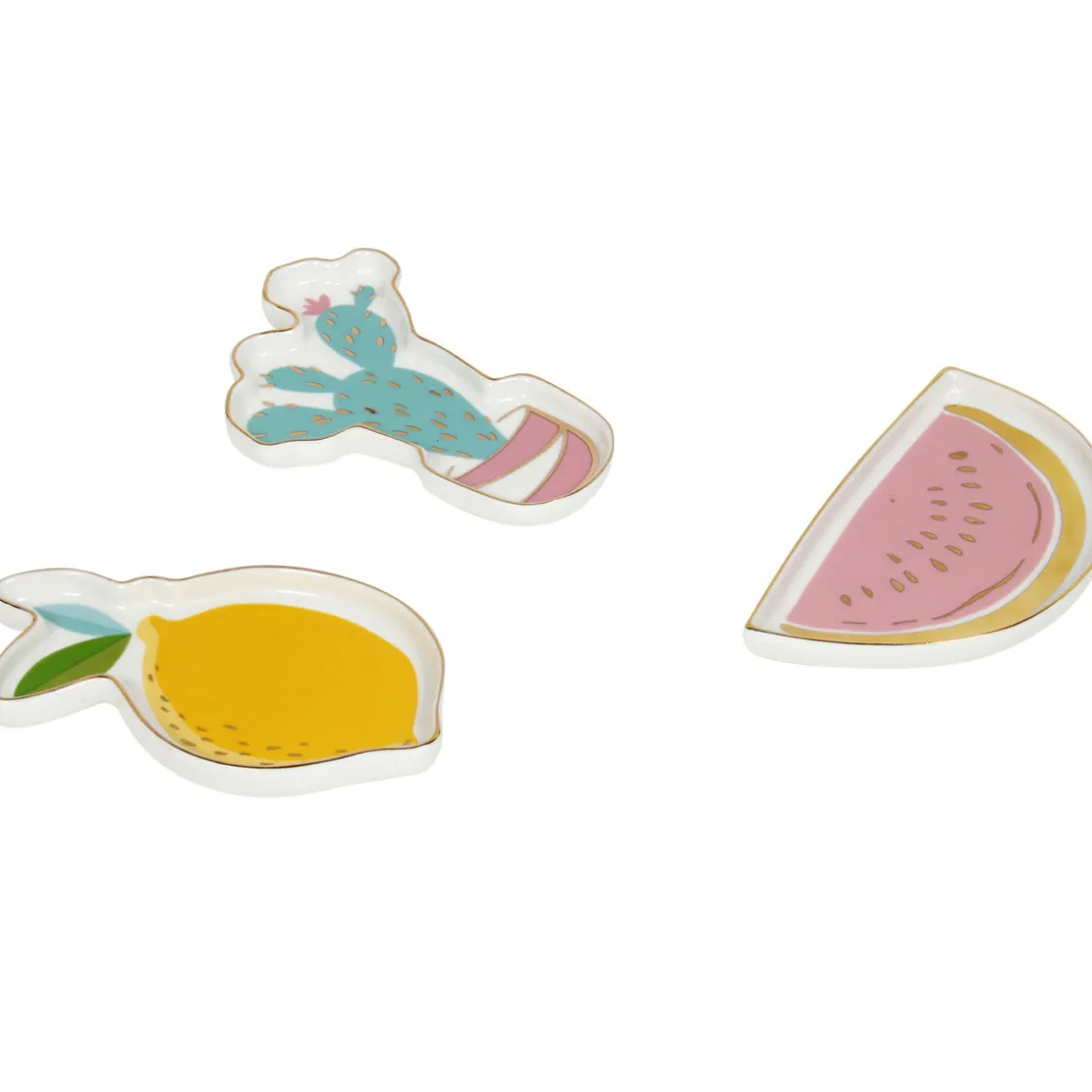 Alors vous, vous êtes plutôt pastèque ou citron ? Peut-être même cactus, si vous préférez vous piquer au jeu de l’insolite. Qu’importe. Avec ce confret de trois vide-poches, vous aurez l’embarras du choix. Gare quand même aux épines !
