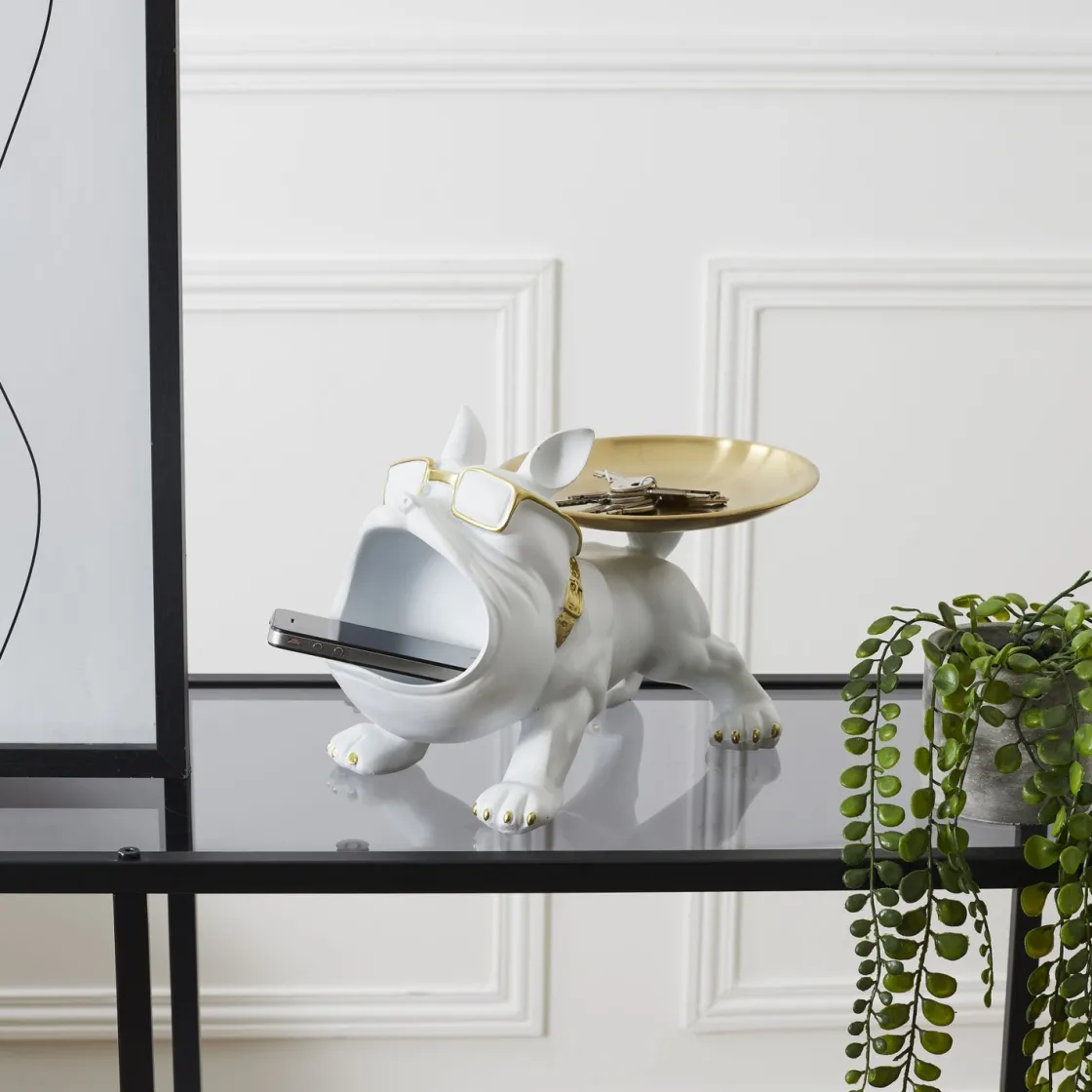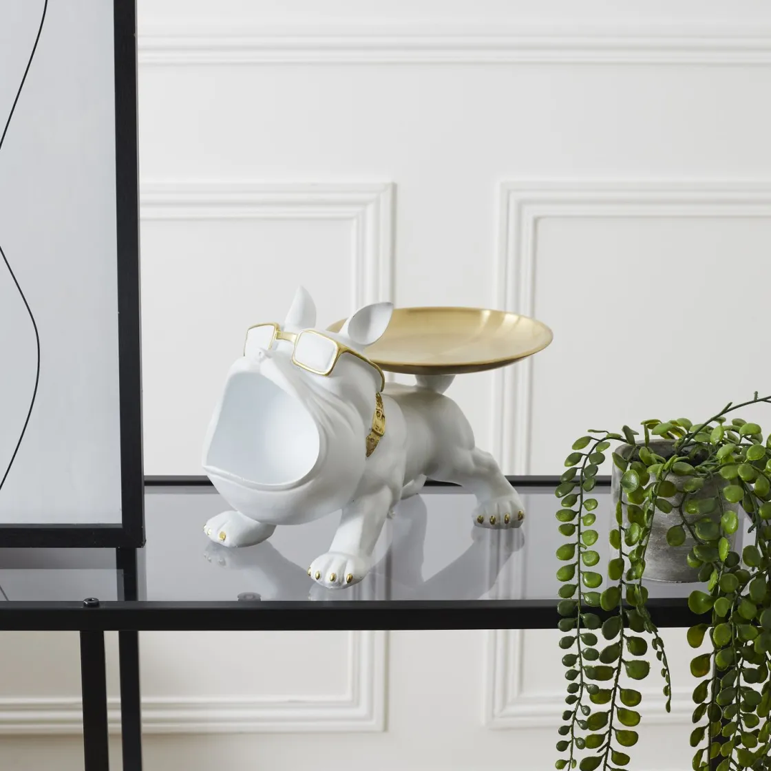 Ce bouledogue blanc, stylé avec des lunettes dorées et un plateau également doré, ne manquera pas d’attirer l’attention dans n’importe quel espace de votre maison.