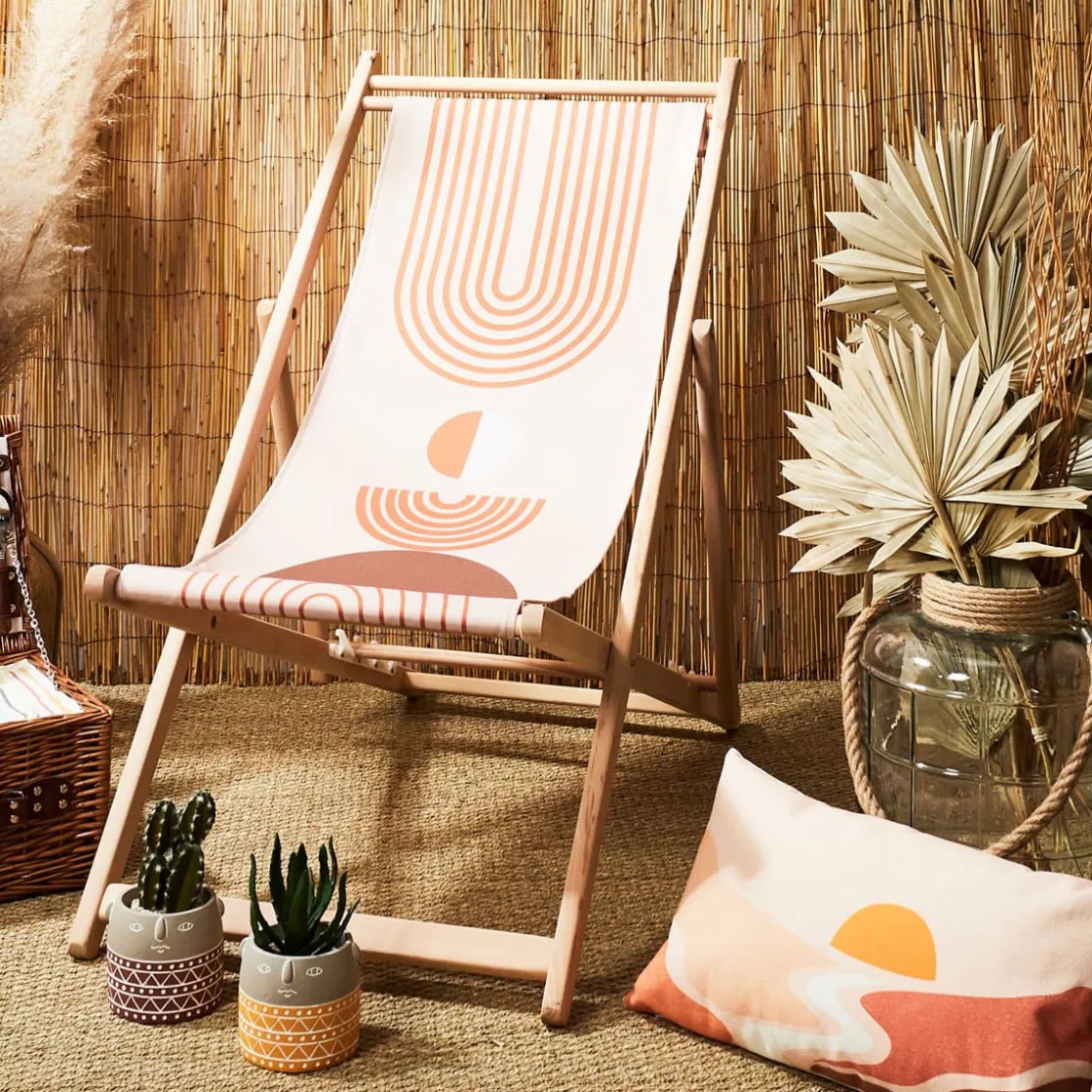 Votre esprit bohème rêve de s’évader loin de la grisaille ambiante, dans un coin de paradis sous les cocotiers ? Avec cette chilienne Archi, votre souhait pourrait bien devenir réalité ! À sortir sans attendre dès le retour des beaux jours, son design aux motifs ethniques vous transportera immédiatement vers d’autres contrées. Idéale pour habiller un jardin, un balcon ou une terrasse dans un esprit bobo chic, cette chaise pliante en bois deviendra en un clin d’œil votre accessoire indispensable de l’été. À adopter seule, en duo, ou à mixer avec d’autres jolis modèles pour un effet dépareillé chic et décalé. Psst ! Laissez-nous vous confier un secret… Nos chiliennes en bois sont toutes garanties made in France. Un gage de respect et de qualité qui vous déculpabilisera de craquer sur ces petites beautés !