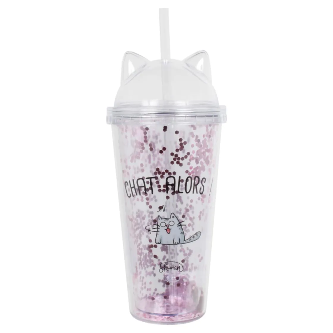 Si vous voyez tout tourbillonner, c’est normal ! Ce sont toutes les paillettes violettes dissimulées dans votre verre paille Chat alors. Apparemment, lui aussi n’en peut plus dès que vous levez le coude. Allez-y quand même avec modération, il ne faudrait pas que l’on vous retrouve par terre.