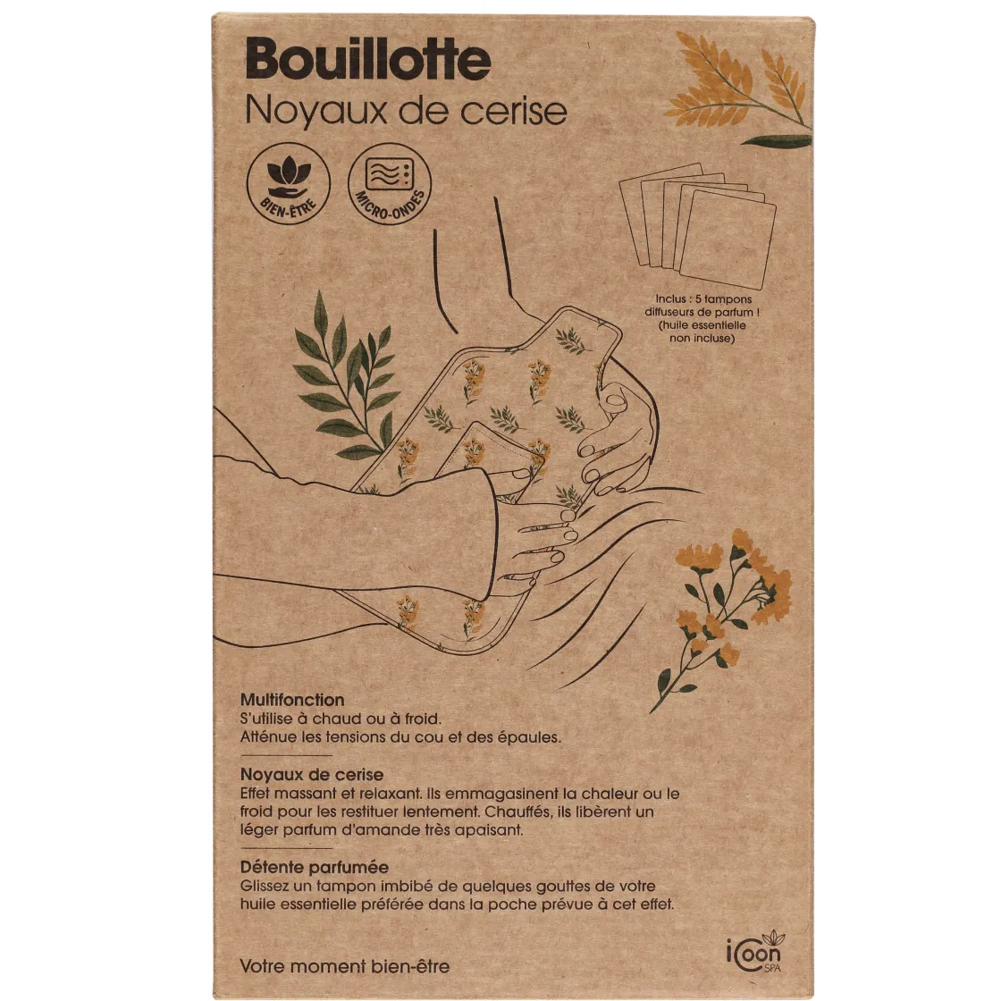 Aussi bien en été qu’en hiver, la bouillotte noyaux de cerises vous apporte détente et relaxation à volonté sur les zones du cou et des épaules. Elle s’utilise à chaud en le passant 1 minute au micro-ondes, ou bien à froid si vous préférez. Et pour profiter des senteurs ensoleillées, vous pouvez glisser un des 5 tampons diffuseurs de parfum dans la poche prévue à cet effet.