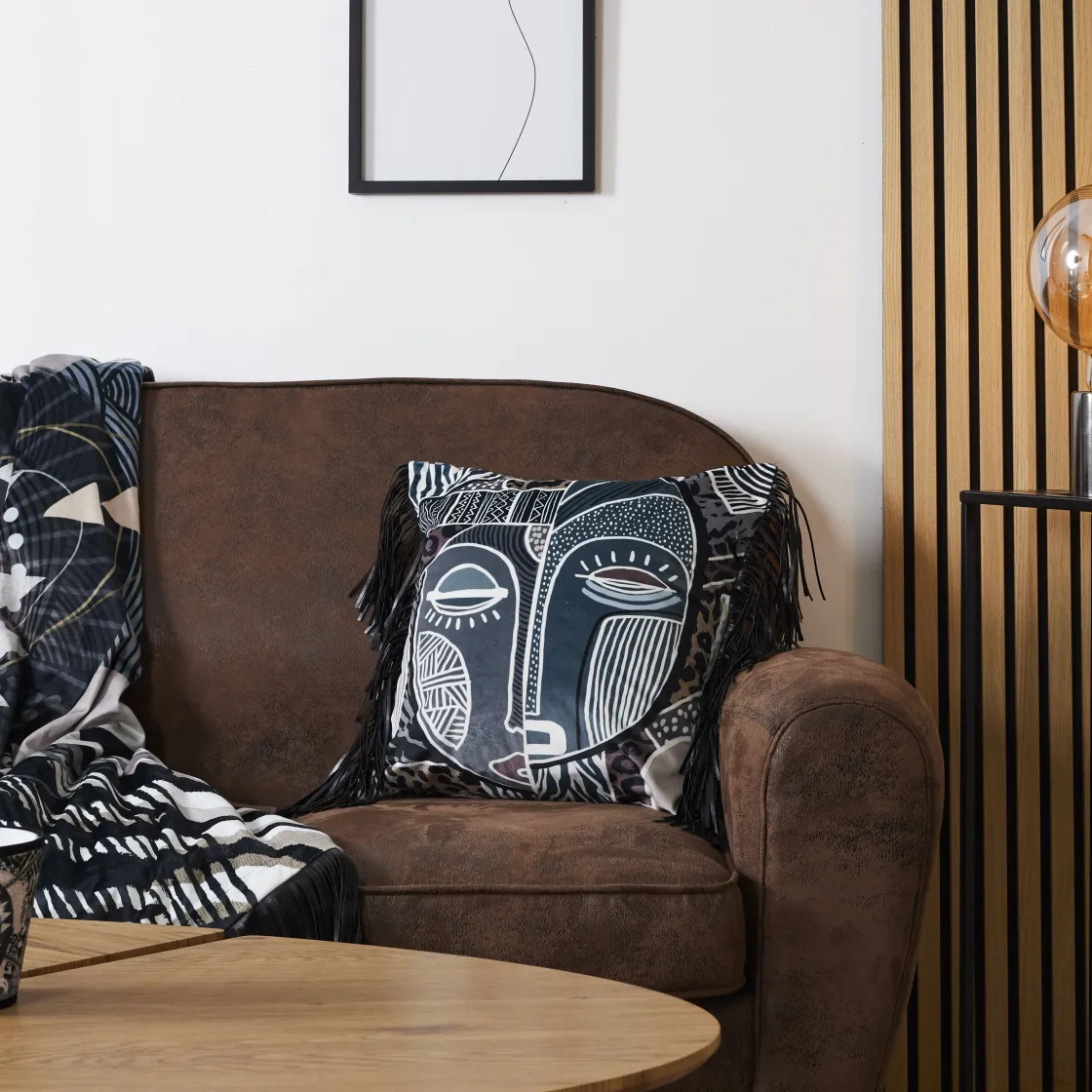 Plongez dans une ambiance douce et chaleureuse avec ce coussin en velours accompagné de ses franges en simili-cuir.