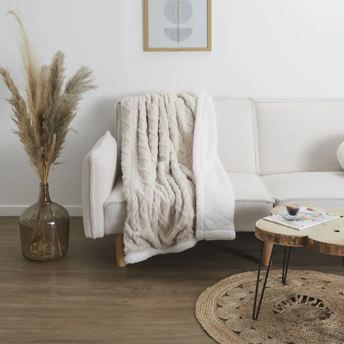 Esthétique neutre : Avec ses tons crème, le Plaid Jacquard Cosy s’intègre harmonieusement dans tout type de décor, ajoutant une touche de sophistication sans effort à votre espace de vie.