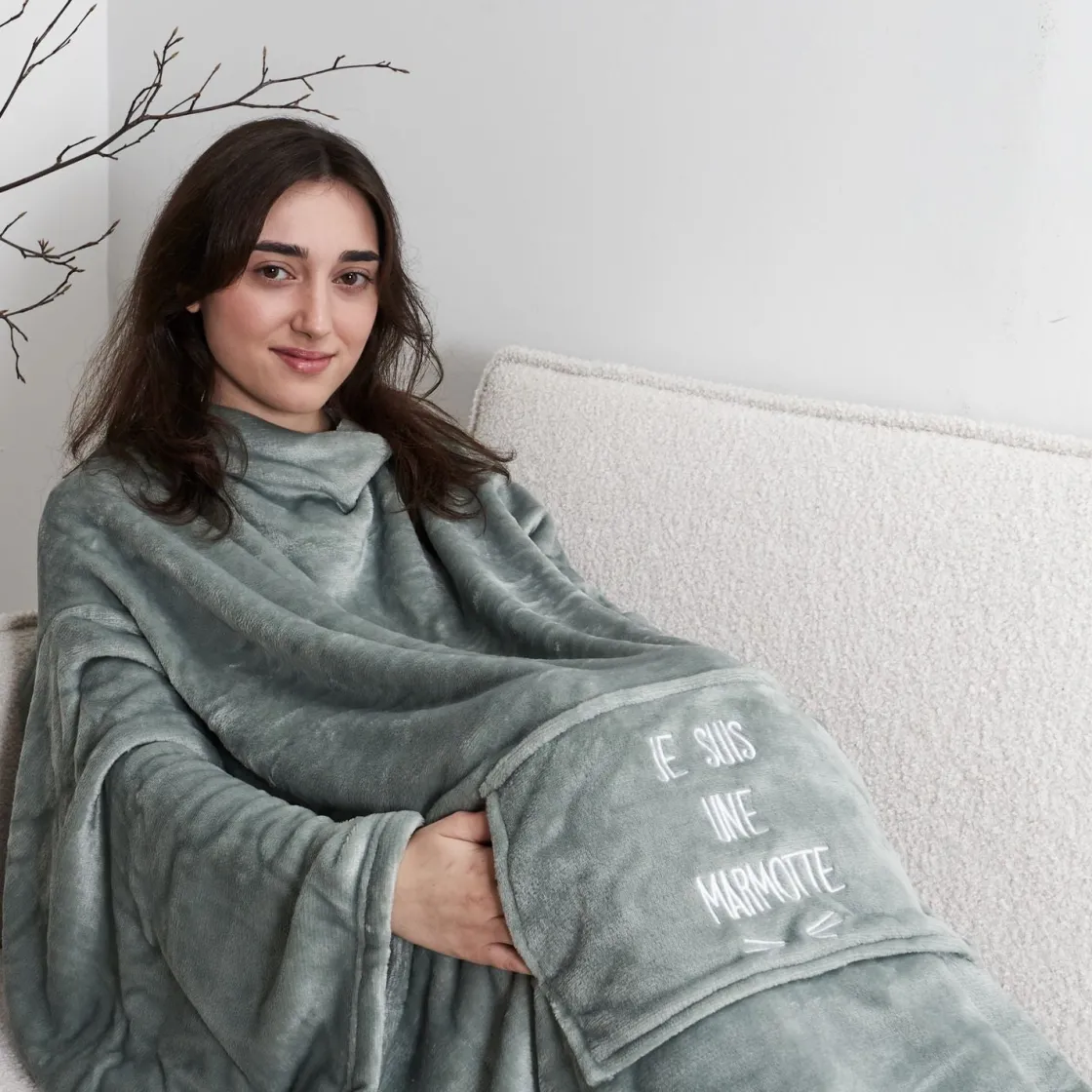 Voici le plaid spécial frileux(ses). La température baisse ? Enfilez votre plaid kangourou marmotte, équipé de manches et de poches il vous recouvre intégralement. Gardez vos mains et vos pieds bien au chaud… Idéal pour une soirée en mode cocooning. Allongé(e) sur le canapé à lire un livre ou regarder la télé vous serez accro à sa chaleur et sa douceur. Astucieux, une fois plié il se transforme en coussin moelleux.