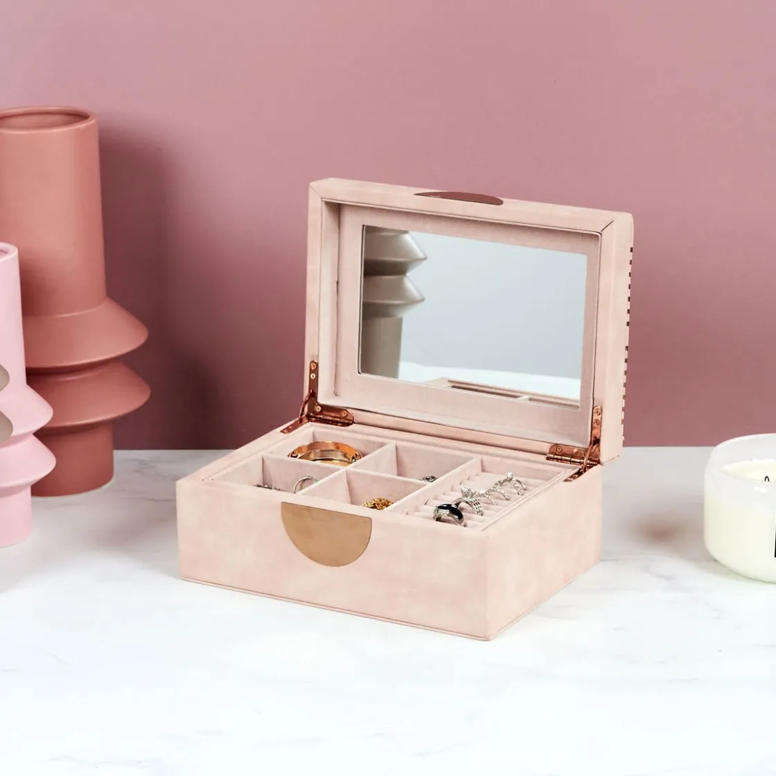 Cette boite à bijoux bohème aux tons nude décorera votre chambre en gardant vos accessoires bien rangés. Un grand miroir très pratique et différents compartiments pour les trier de manière logique et surtout sans les abîmer. Sur une coiffeuse, une étagère ou un bureau, son style chic et sa couleur poudrée apporteront une touche élégante à l’endroit où vous la poserez. À adopter ou à offrir sans plus tarder !