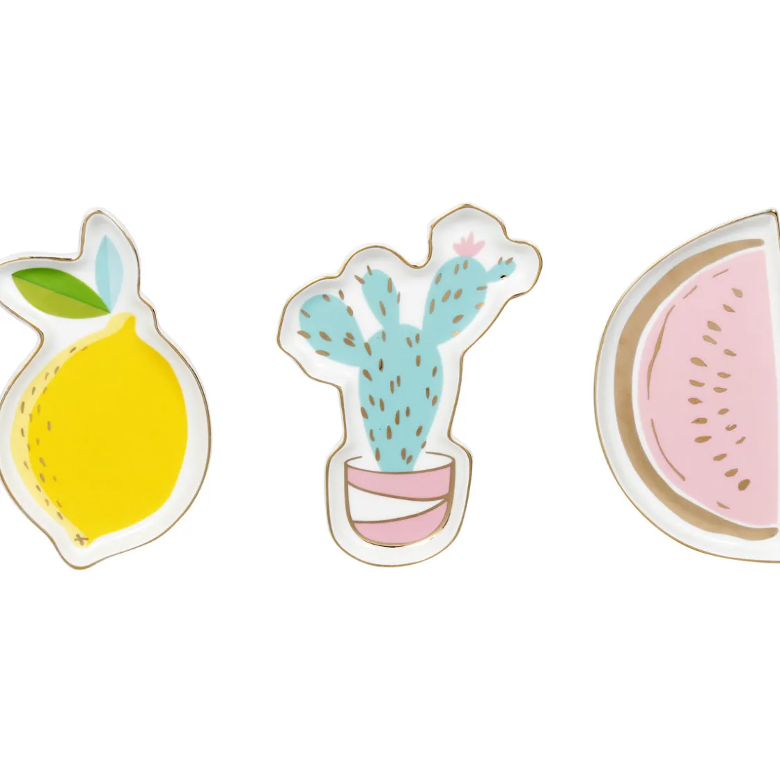 Alors vous, vous êtes plutôt pastèque ou citron ? Peut-être même cactus, si vous préférez vous piquer au jeu de l’insolite. Qu’importe. Avec ce confret de trois vide-poches, vous aurez l’embarras du choix. Gare quand même aux épines !