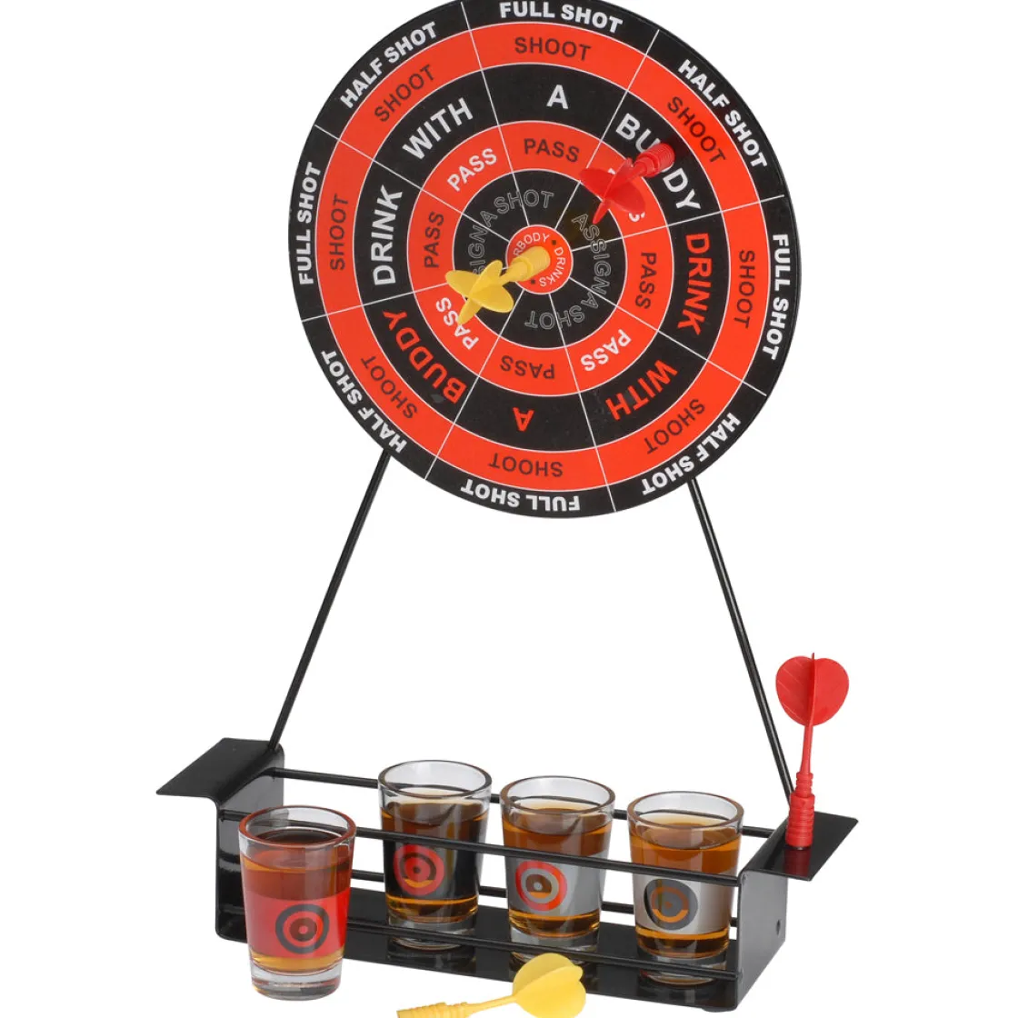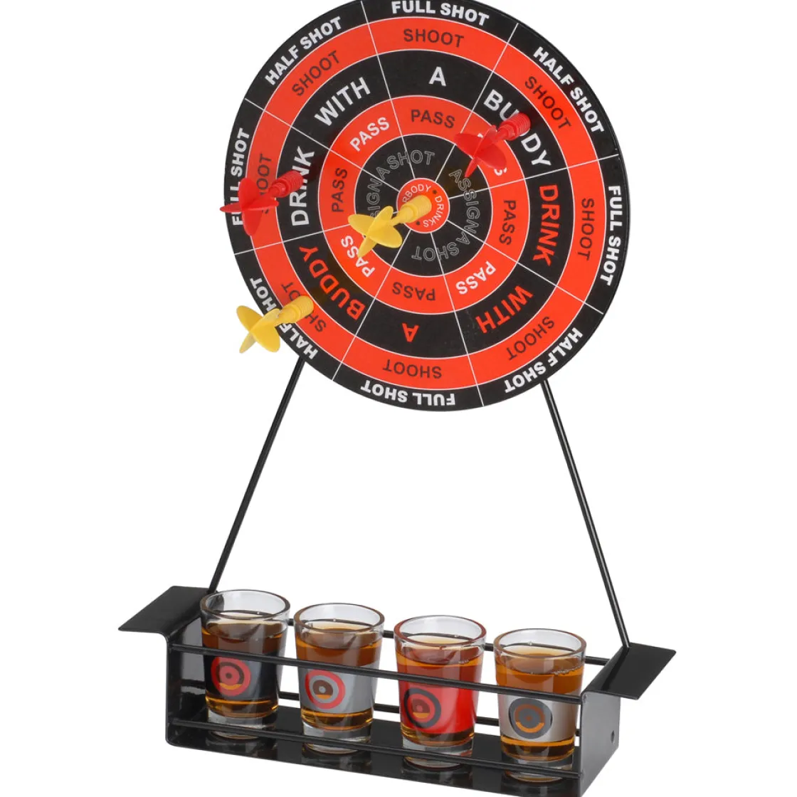 Ce jeu de flèchettes devrait vous motiver pour bien viser : atteignez le centre de la cible et c’est la tournée générale ! Chaque zone de la cible correspond à un gage : boire un demi-verre, un verre entier, boire avec un ami… Jouez avec modération… l’abus d’alcool est dangereux pour la santé.