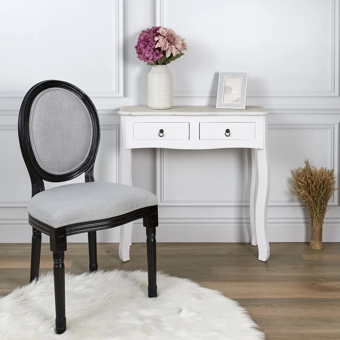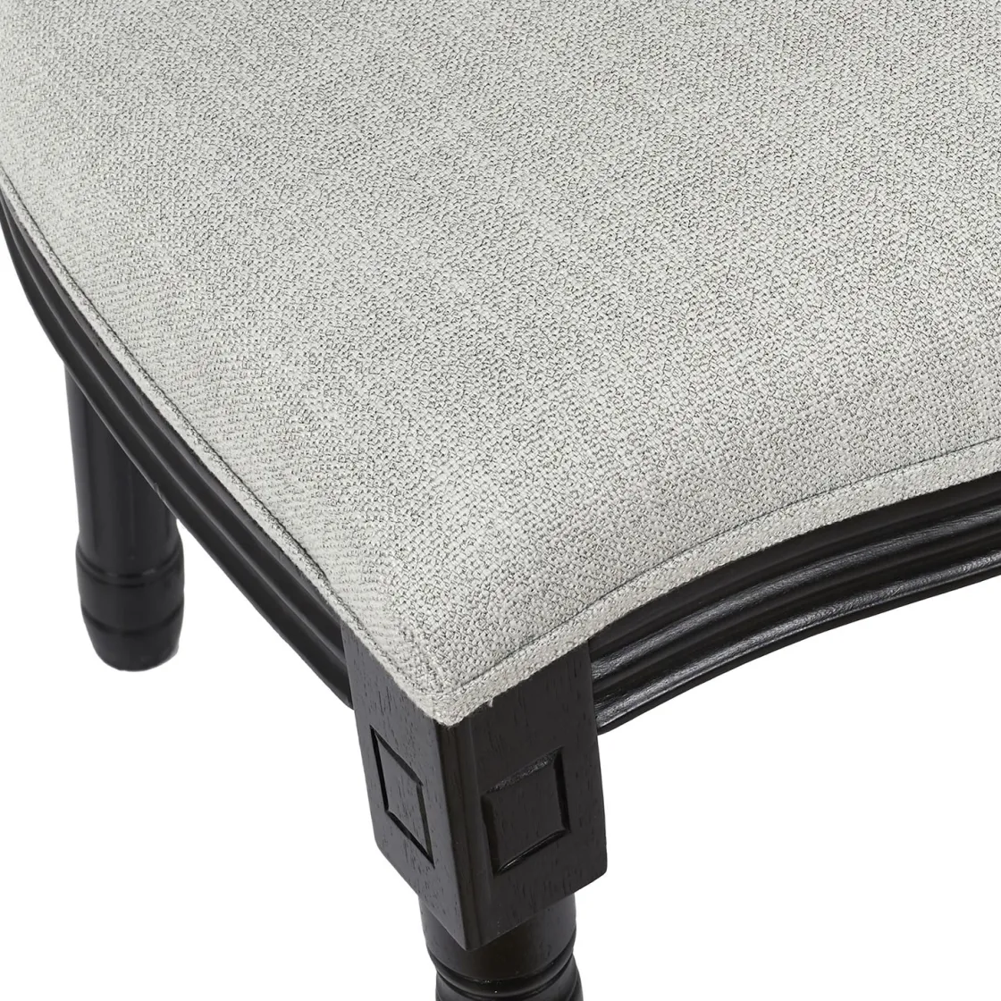Quand le classique chic rencontre la modernité, ça donne la chaise Eleonor. Vous allez être séduits par cette chaise aux pieds sculptés en bois noir, et son assise en tissu gris très chic. Elle ornera votre salle à manger, et aura un effet whaou sur vos convives!