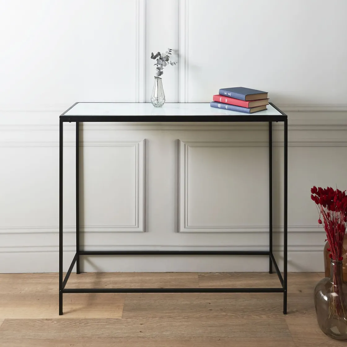 Jetez-en plein la vue aux invités qui franchissent votre porte d’entrée avec cette console rectangulaire aux styles contemporain et élégant. Avec son plateau en verre effet marbre et ses pieds en métal, elle apportera une touche moderne à votre décoration.