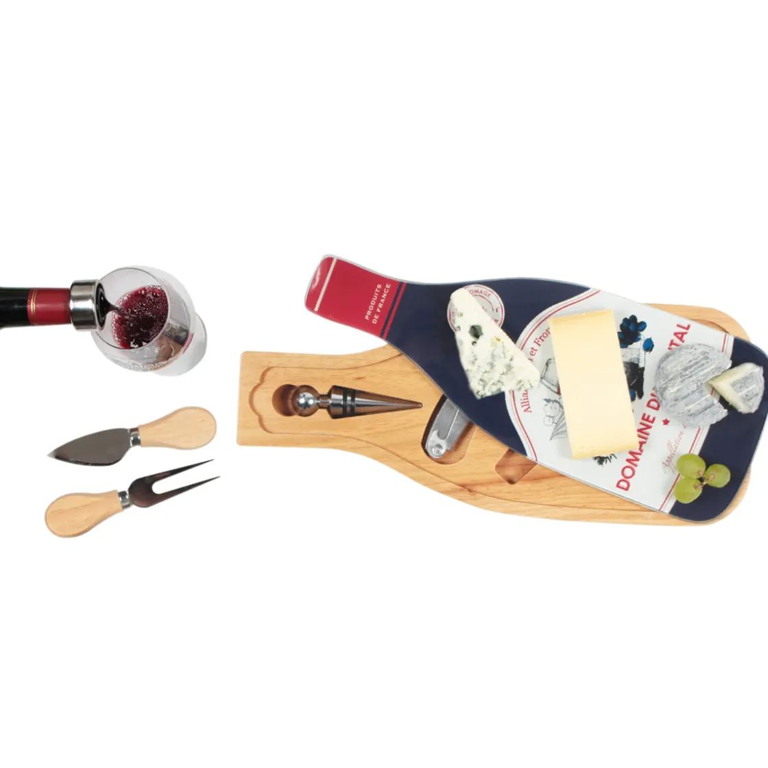 - Contient : 1 stop-gouttes, 1 bouchon, 1 tire-bouchon, 1 fourchette, 1 couteau